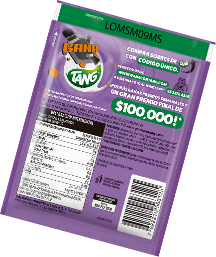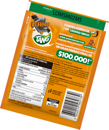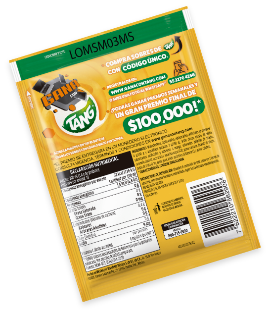 Entra a ganacontang.com o vía WhatsApp al +52 55 74 69 99 60 y registra el Código único de cada sobre de Tang® para acumular puntos al instante.